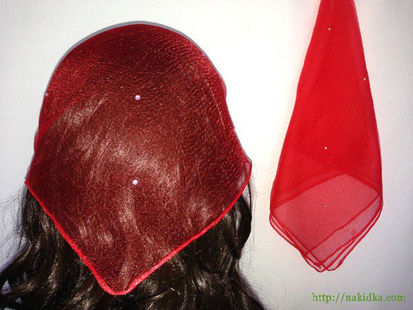 | Красная нейлоновая косынка с наклееными блестящими камушками |