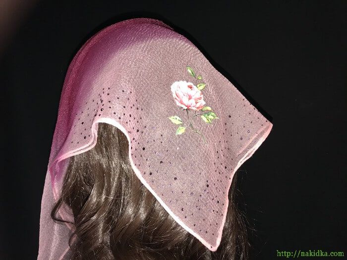| Бордовая с розовым двутонная нейлоновая косынка с наклееным виниловым узором и блестящими камушками |