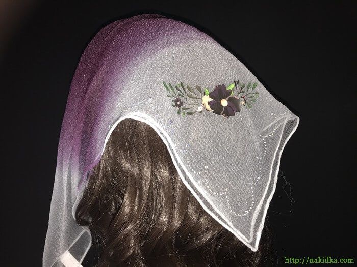 | Бордово-баклажановая с белым двутонная нейлоновая косынка с наклееным виниловым узором и узором с блестящими камушками |