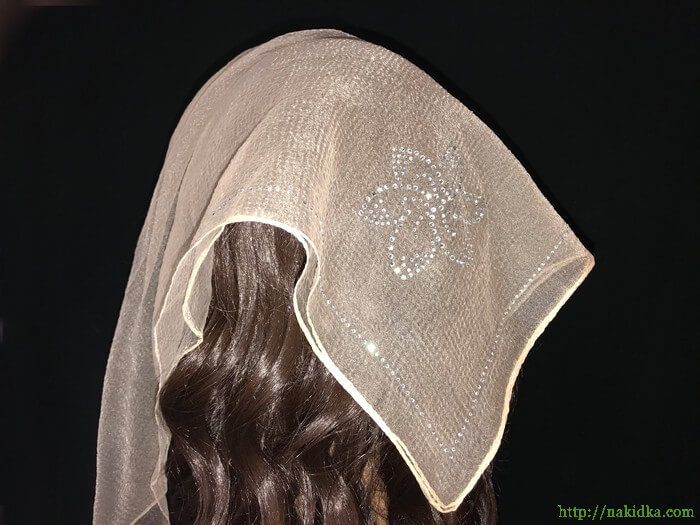 | Абрикосовая однотонная нейлоновая косынка с наклеенными блестящими узорами и камушками по краям |