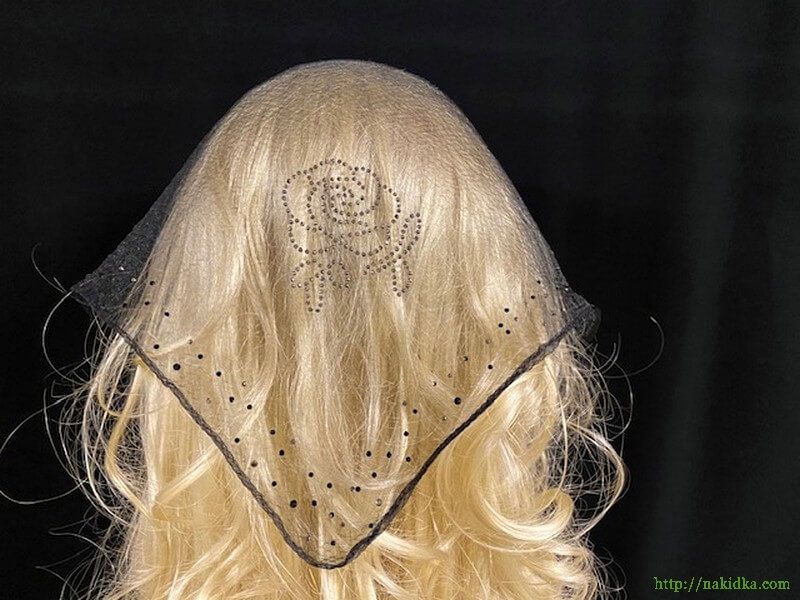 | Черная однотонная нейлоновая косынка с наклееной черной розочкой и камушками по краям |