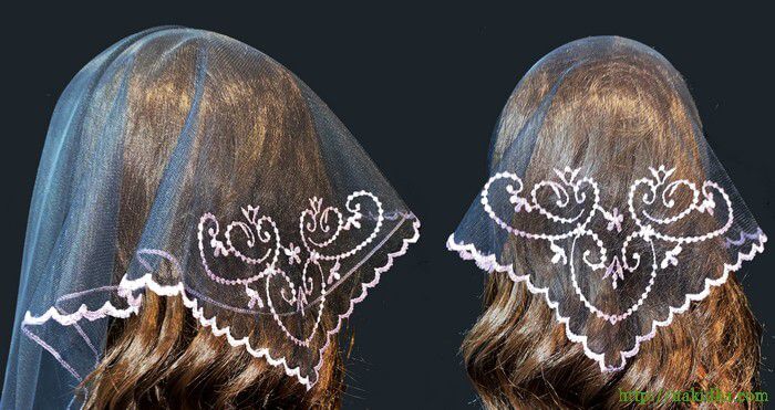 | Черная легкая фатиновая косынка с серо-фиолетовым вышитым узором |