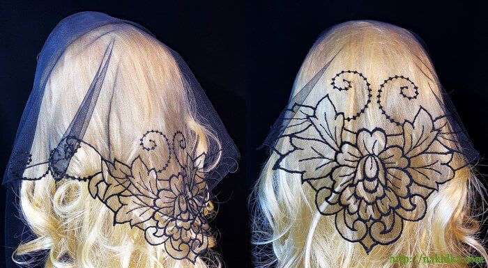 | Черная легкая фатиновая косынка с черным вышитым узором |