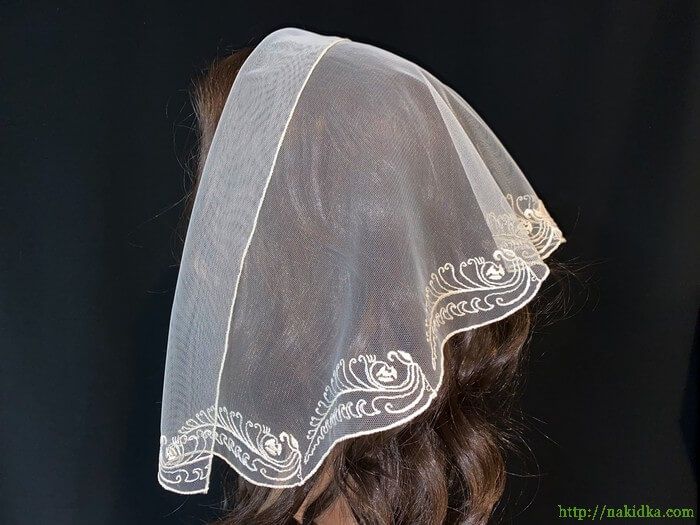 | Светло-бежевая легкая фатиновая накидка с белым вышитым узором |