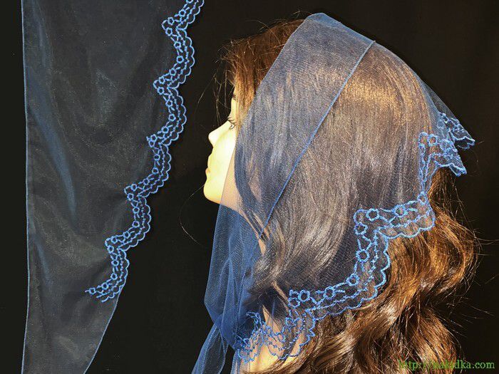 | Темно-синий легкий фатиновый треугольный шарф с синим вышитым узором |