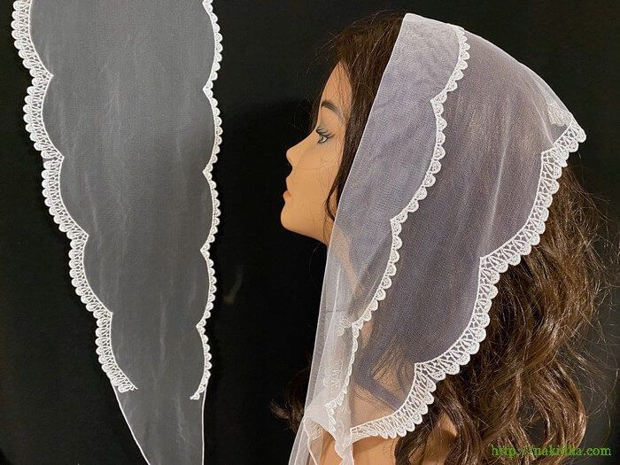 | Белый легкий фатиновый треугольный шарф с белым вышитым узором |