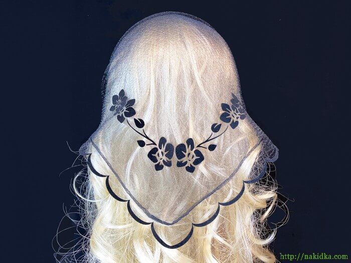 | Черная однотонная нейлоновая косынка с наклеенным черным флоковым узором и волнистым ободком |
