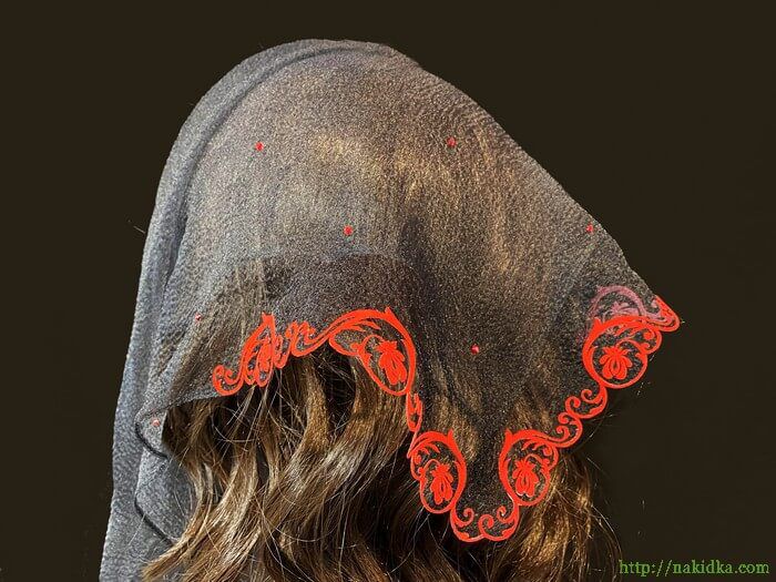 | Черная однотонная нейлоновая косынка с наклеенным красным флоковым узором, вырезанным ободком и наклееными красными камушками |