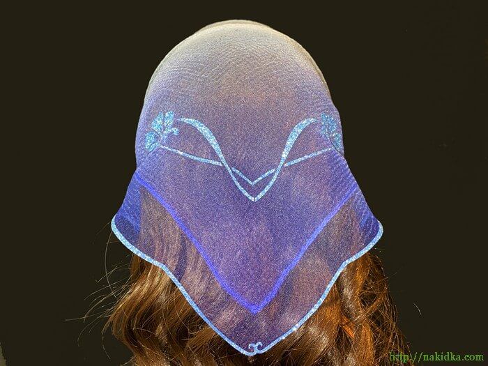| Голубая с синим двутонная нейлоновая косынка с наклеенным голубым блестящим узором и вырезанным ободком |