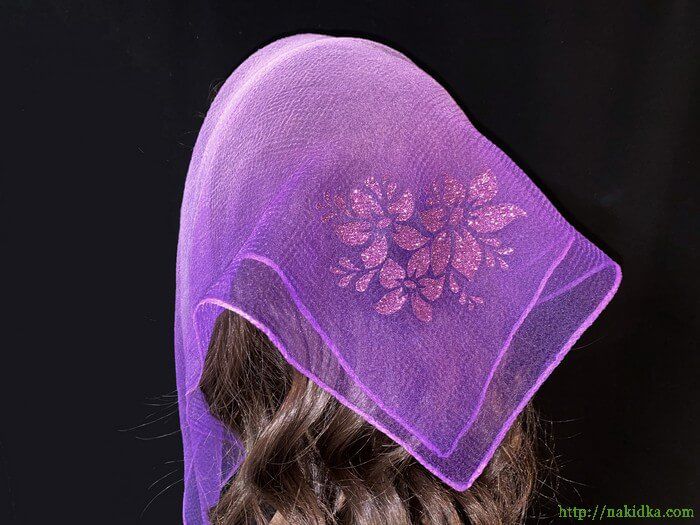 | Светло-фиолетовая с фиолетовым двутонная нейлоновая косынка с наклеенными фиолетовым блестящим узором |