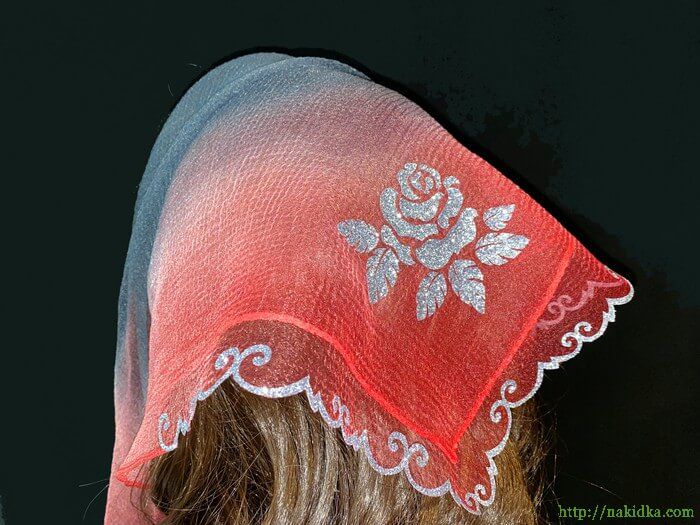 | Черная с красным двутонная нейлоновая косынка с наклеенным серебристым узором и вырезанным ободком |