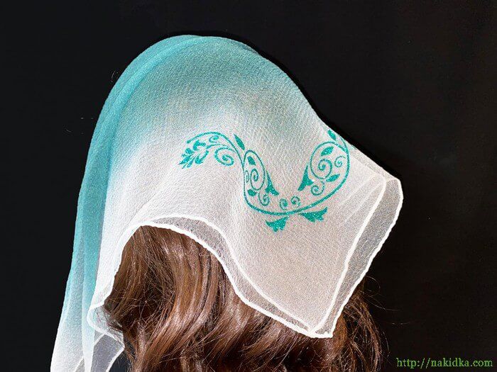 | Темно-зеленая с белым двутонная нейлоновая косынка с наклеенным зеленым блестящим узором |