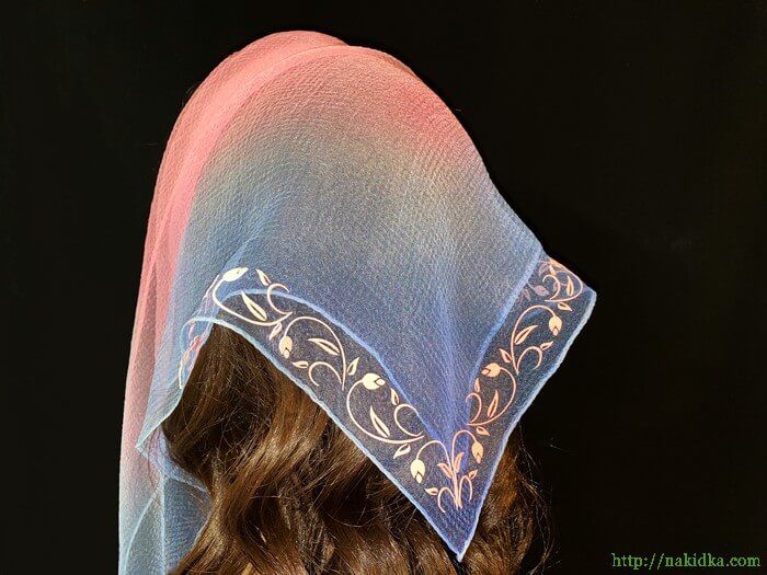 | Розовая с голубым двутонная нейлоновая косынка с наклеенными розовым флоковым узором |