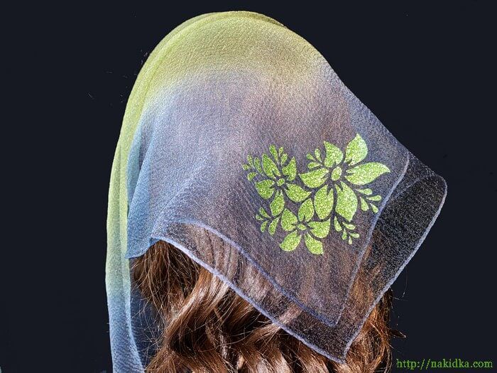 | Оливковая с черным двутонная нейлоновая косынка с наклеенным оливковым блестящим узором |