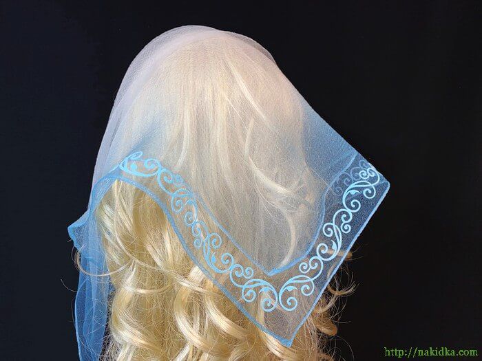 | Белая с голубым двутонная нейлоновая косынка с наклеенными голубым флоковым узором |