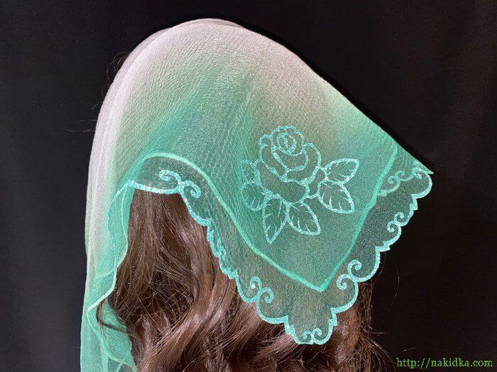 | Белая с зеленым двутонная нейлоновая косынка с наклеенным зеленым блестящим узором и вырезанным ободком |