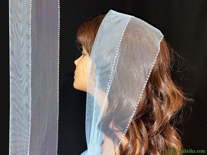 | Светло-голубой легкий фатиновый шарф с наклееными блестящими камушками по ободку |
