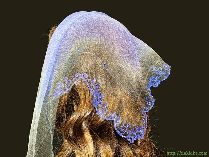| Синяя с черным двутонная нейлоновая косынка с наклеенным синим блестящим узором и синими камушками и с вырезанным ободком |