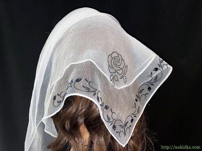 | Белая однотонная нейлоновая косынка с наклеенным черным флоковым узором и черным узором розочкой |