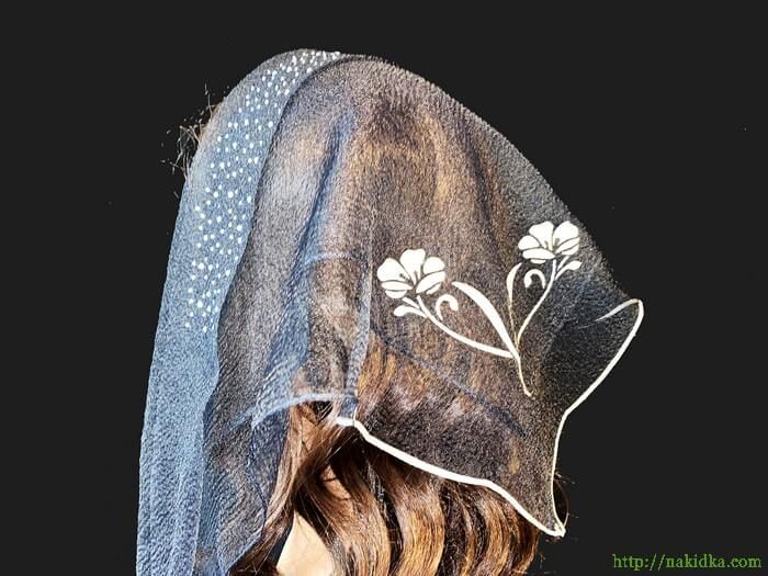 | Черная однотонная нейлоновая косынка с наклеенным серебристым блестящим флоковым узором и волнистым ободком, с проклееным передним краем и наклееными на нем блестящими камушками |