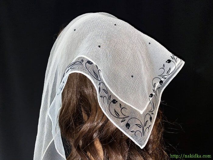 | Белая однотонная нейлоновая косынка с наклеенным черным флоковым узором и черными камушками |