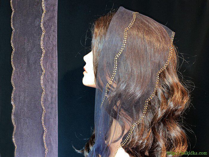 | Темно-коричневый легкий фатиновый шарф с наклеенным золотистым узором и вырезанным ободком |