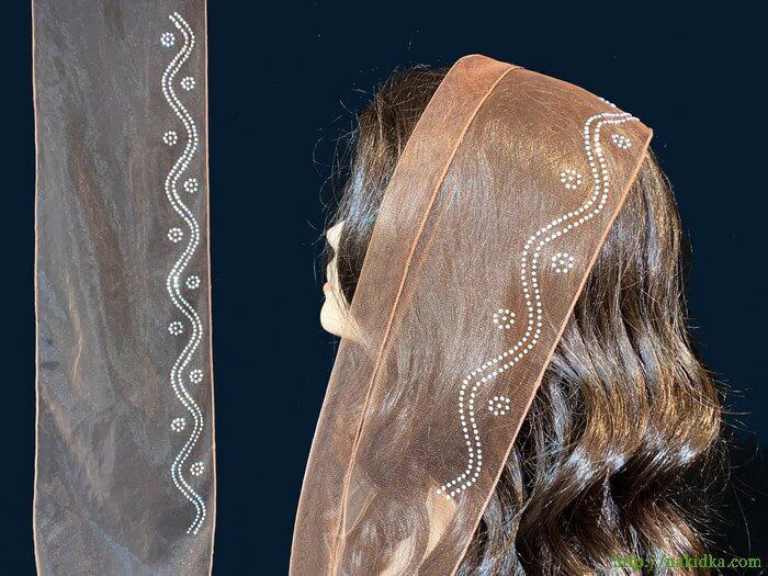 | Детский светло-коричневый фатиновый шарф с наклееным серыми камушками |