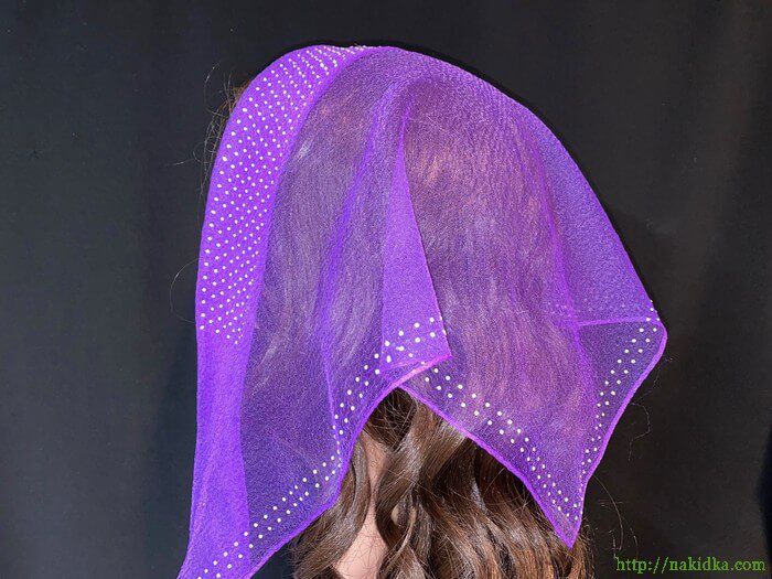 | Фиолетовая однотонная нейлоновая косынка с наклеенным блестящим узором сзади и на подвернутом проклееном ободке |