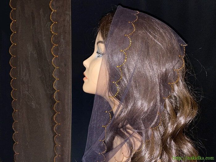 | Темно-коричневый легкий фатиновый шарф с наклеенным золотистым узором и вырезанным ободком |