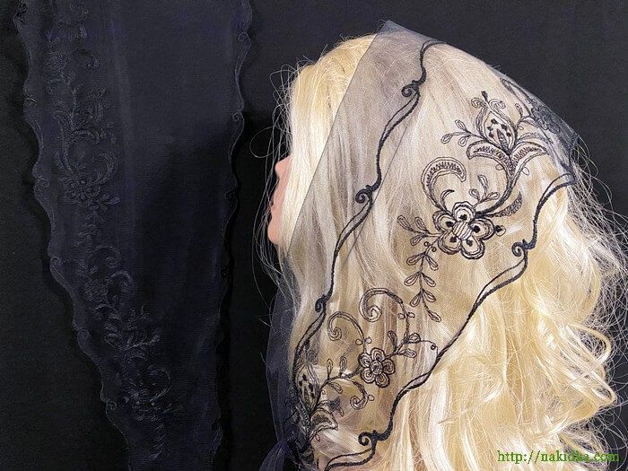 | Черный легкий фатиновый треугольный шарф с черным вышитым узором |