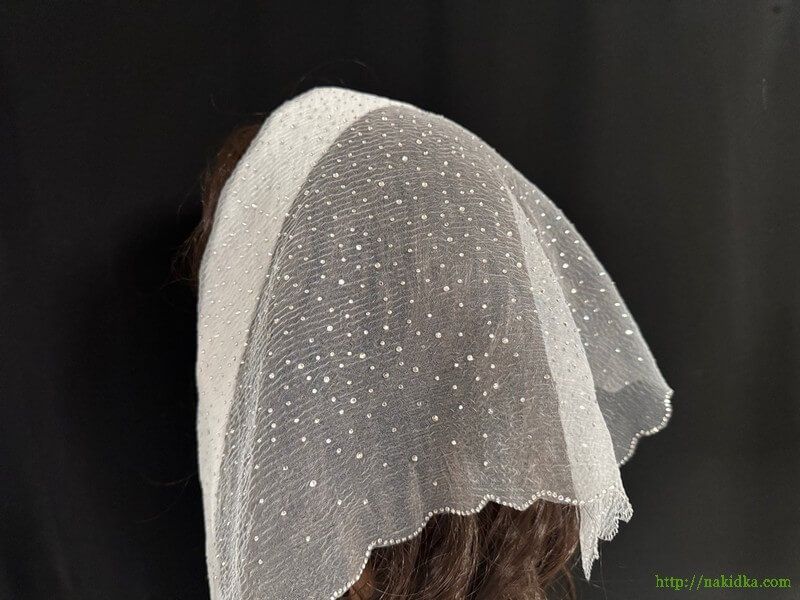 | Белая косынка с подвернутым передним краем с наклееными блестящими камушками |