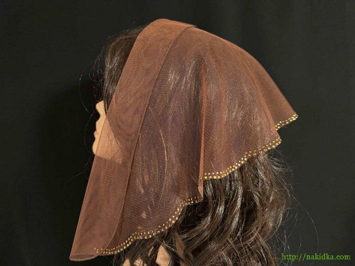 | Коричневая фатиновая накидка с золотистыми наклееными камушками на заднем ободке |