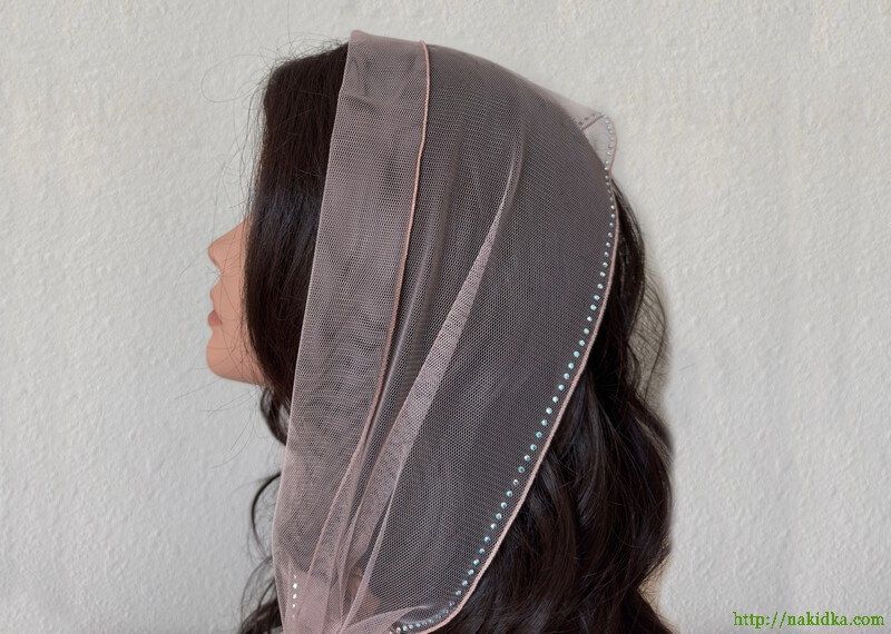 | Светло-розовый шарф с наклееными блестящими камушками на ободке |