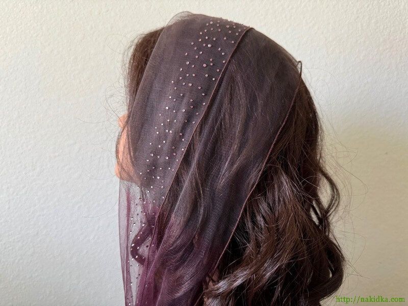 | Утененный фатиновый шарф с кофейно-серой серединой и баклажано-коричневыми краями с наклееными фиолетовыми камушками |