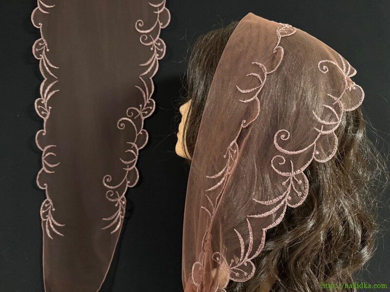 | Светло-коричневый фатиновый треугольный шарф с коричневым вышитым узором |