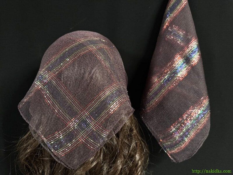 | Коричнево-баклажановая однотонная нейлоновая косынка с радужной люрексовой полоской |