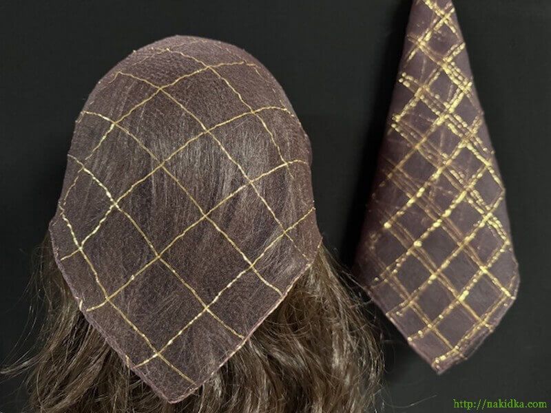 Коричнево-баклажановая нейлоновая косынка в золотую клетку