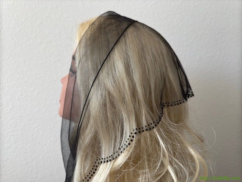 | Черный фатиновий треугольный шарф с наклеенным блестящим узором на вырезанной задней кромке |