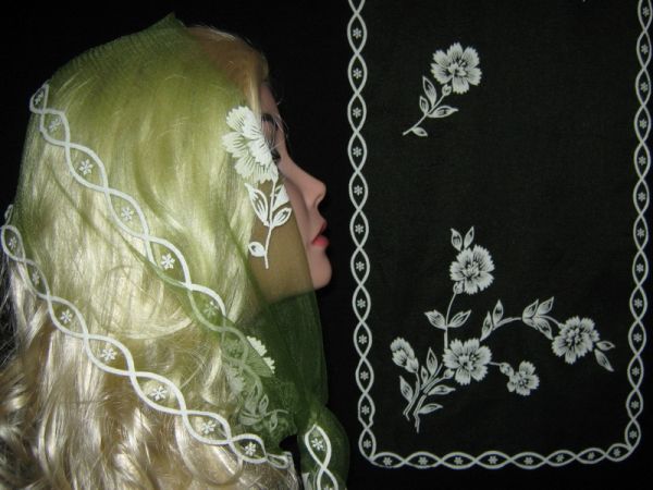 | Зелено-салатовый однотонный нейлоновый шарф с белым рисунком и ободком |