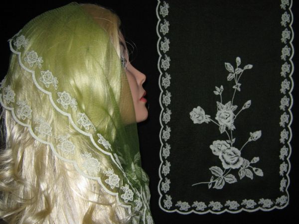 | Зелено-салатовый однотонный нейлоновый шарф с белым рисунком и ободком |