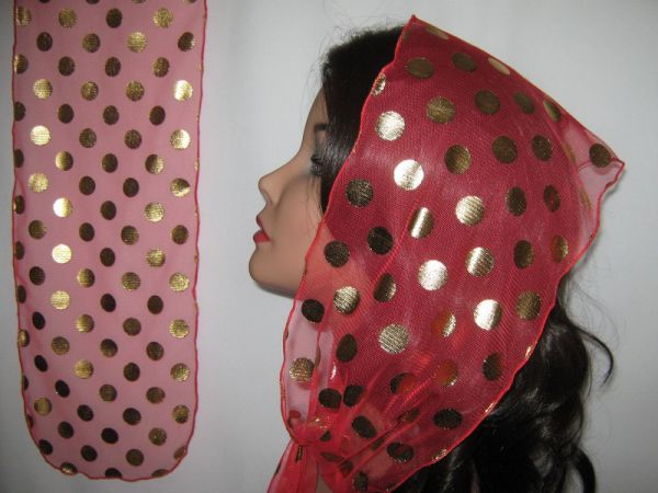 | Красный фатиновый шарф с большими золотистыми блестками и волнистым ободком |