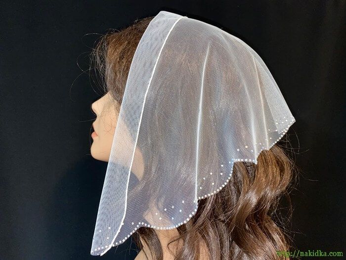 | Белая легкая фатиновая накидка с волнистой нижней кромкой и наклееными по ее контуру блестящим узором |