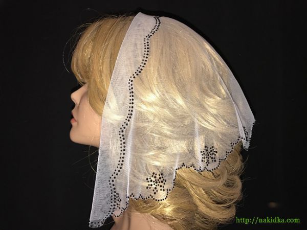 | Белая легкая фатиновая накидка с волнистой кромкой и наклееными по ее нижнему контуру черным узором |