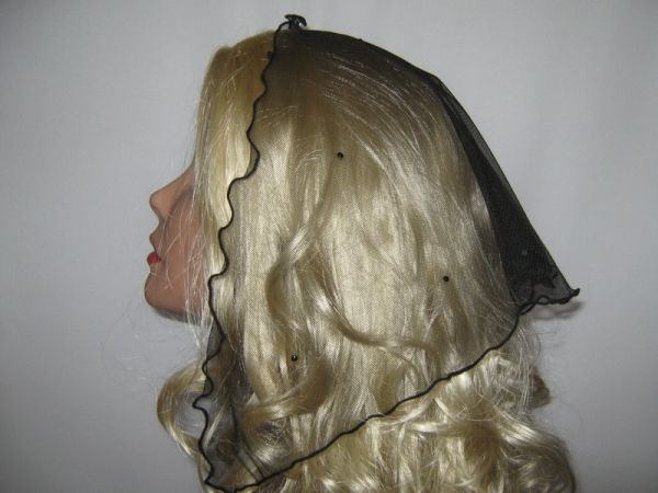 | Черная фатиновая накидка с наклееными черными камушками и черным волнистым ободком |