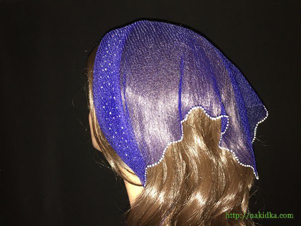 | Синяя однотонная косынка с блестящими узорами на подвернутом крае и на волнистом ободке |